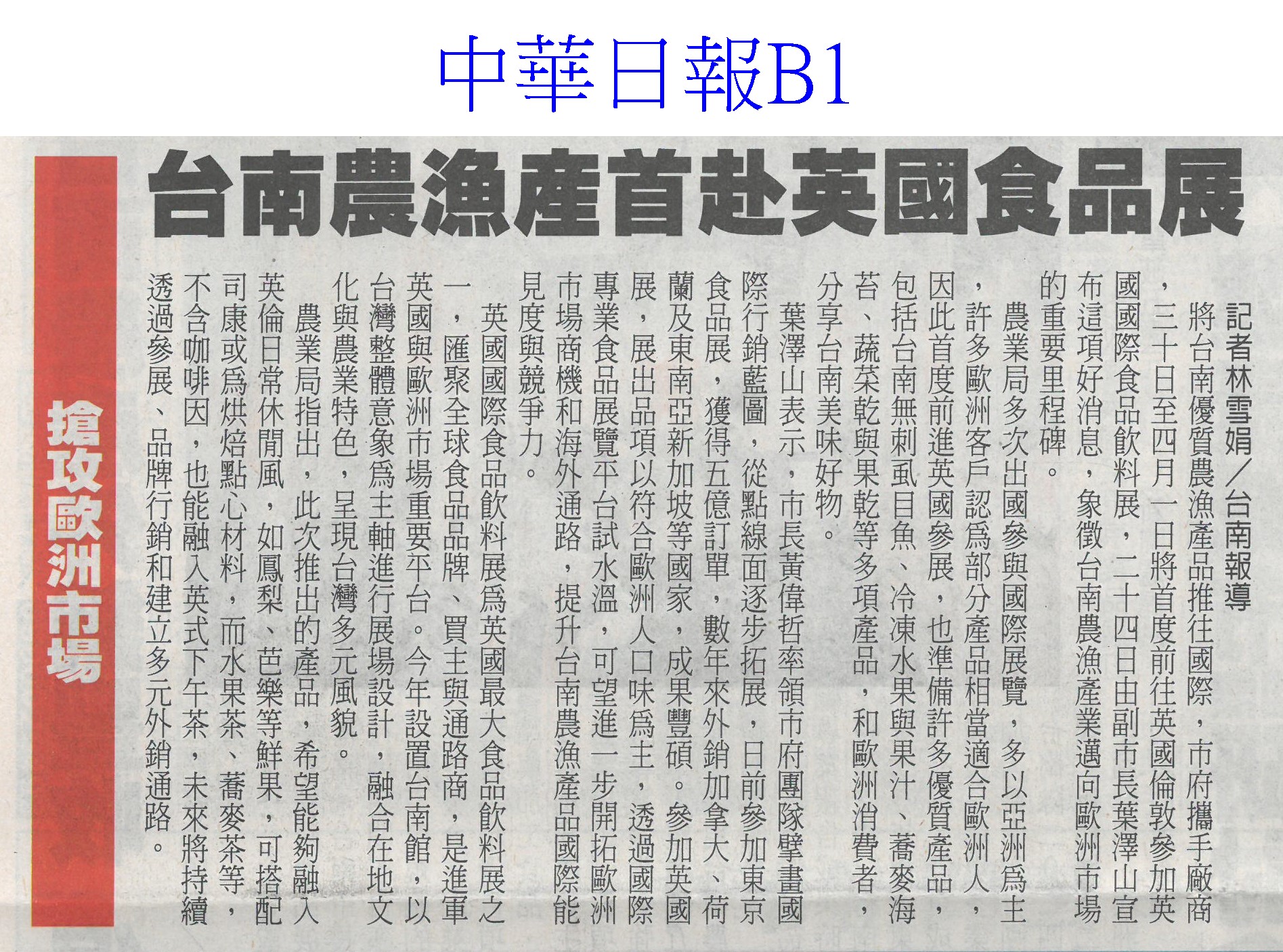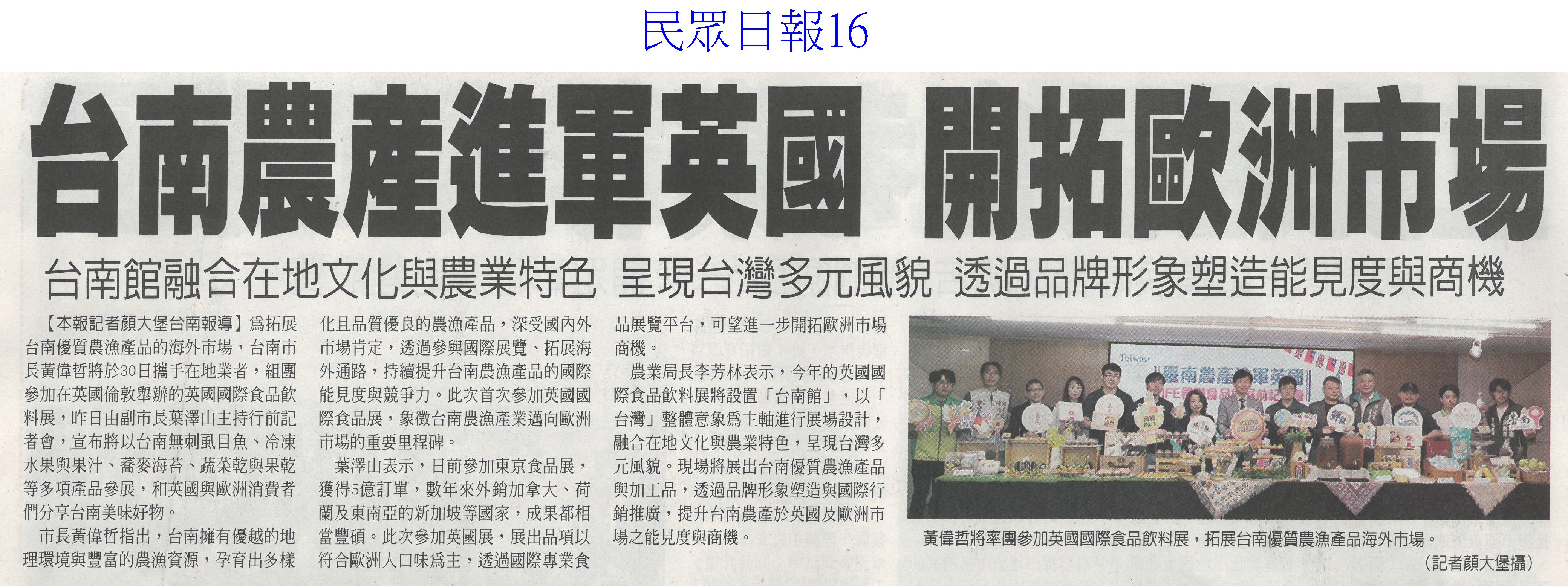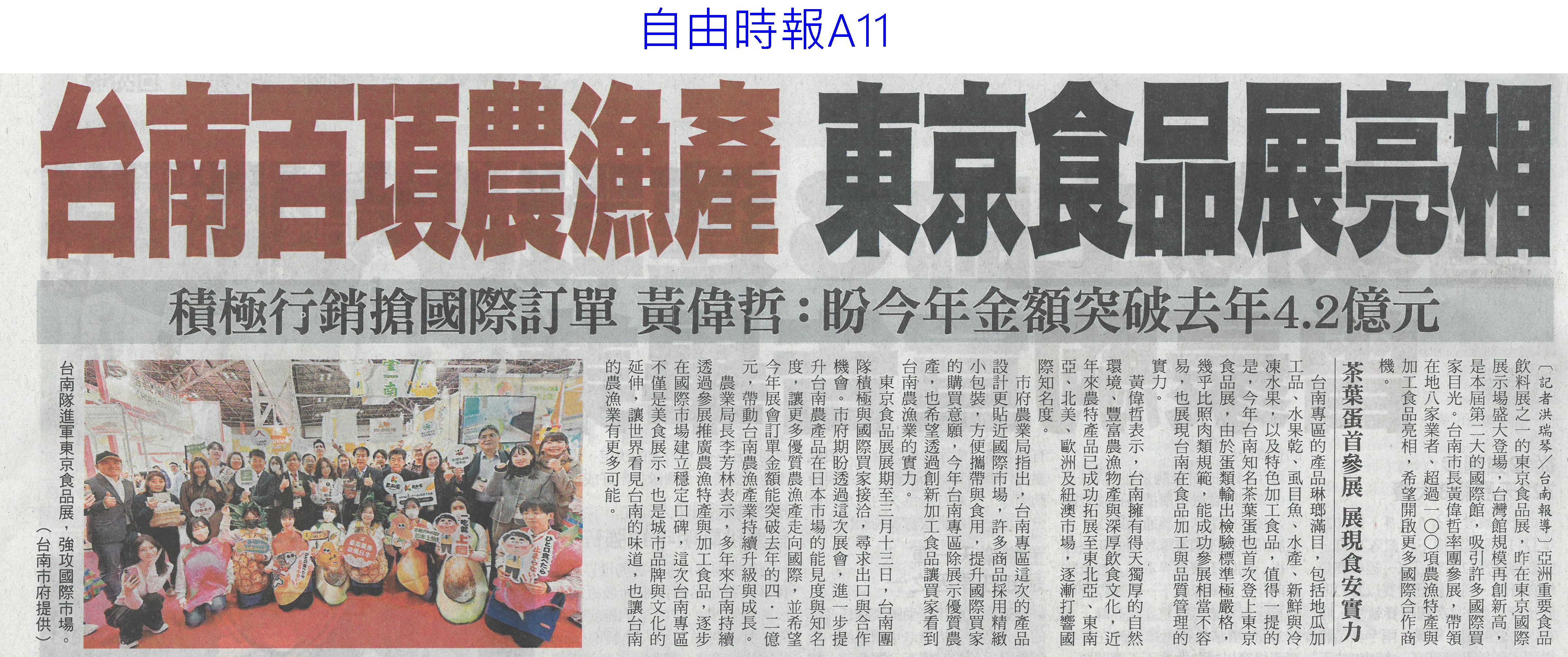 首頁番茄搶先報 番茄搶先報 排序 發布日期 更新日期 序號 發布日期 標題 1. 115/03/25 後壁洋香瓜盛產 霜淇淋熱賣(中華日報B1) 2. 115/03/25 台南農漁產首赴英國食品展(中華日報B1) 3. 115/03/25 台南農產進軍英國 開拓歐洲市場(民眾日報16) 4. 115/03/25 導入農膜敷蓋栽培 地瓜增產逾2倍(自由時報A9) 5. 115/03/23 成分有夠乾淨!老字號番茄醬「超單純配料表」曝光 網狂讚:只加這牌 6. 115/03/22 嘉義縣小番茄橫掃全台評選獎項 翁章梁返台現身微風超市應援 7. 115/03/19 肥料價波動 陳駿季:夠供應六至八個月(臺灣時報3) 8. 115/03/19 西半部75年來最乾冬季 農業部啟動多元抗旱(自由時報A7) 9. 115/03/19 肥料進口多元 農業部:庫存撐半年無虞(自由時報A7) 10. 115/03/19 雲嘉南灌溉系統串接工程通水(民眾日報4) 11. 115/03/16 雲林3座教育農園改造 年底完工(自由時報A9) 12. 115/03/16 台灣50年來最大水利工程 雲嘉南灌溉系統通水了(自由時報A1) 13. 115/03/16 東京食品展 台南農漁訂單破5億(中華日報B2) 14. 115/03/16 楠西棗到新出路 樹下茶席饗客(中華日報B1) 15. 115/03/16 梅嶺青梅時節到 產量減 賣相佳(中國時報A9) 16. 115/03/16 小番茄價格低迷,風災重創未癒,進口櫻桃又壓境,嘉義青農咬牙苦撐 17. 115/03/13 台日簽MOU 台灣有機產品供應日本(民眾日報3) 18. 115/03/13 嘉市6家好店 參加東京國際食品展(民眾日報16) 19. 115/03/13 台南百項農漁產 東京食品展亮相(自由時報A11) 20. 115/03/13 嘉縣推動智慧農業 最高補助(中國時報A9) 第 1/175 頁,共 3489 筆到第123456789101112131415161718192021222324252627282930313233343536373839404142434445464748495051525354555657585960616263646566676869707172737475767778798081828384858687888990919293949596979899100101102103104105106107108109110111112113114115116117118119120121122123124125126127128129130131132133134135136137138139140141142143144145146147148149150151152153154155156157158159160161162163164165166167168169170171172173174175頁下一頁每頁103070筆資料
