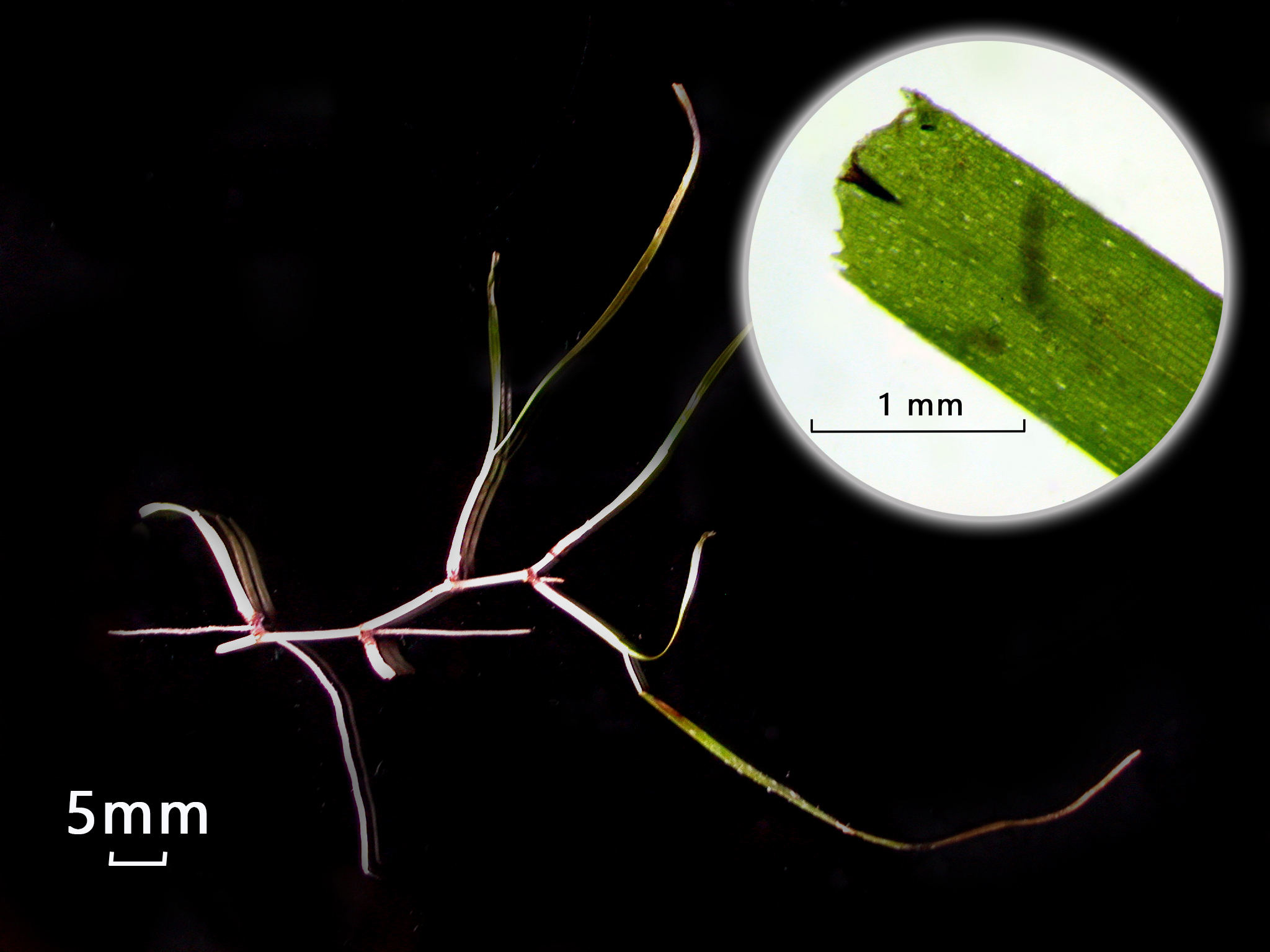 分類同屬二藥草屬,其形態與單脈二藥草相似,二者容易混淆,過去常與單脈二藥草被誤認為同一種。二者最大的辨別在於葉片寬度,本種成熟的葉片纖細,葉寬在1 mm以下,且植被密度較為稀疏。葉片前端呈鋸齒狀,單一縱向葉脈,葉脈前端具1黑色短小斑紋,其生長群聚也較為鬆散。過去在澎湖線葉形的海草多被指為是線葉二藥草,但經過普查後,反而發現本種的族群分布很少,且多分布於亞潮帶海域。