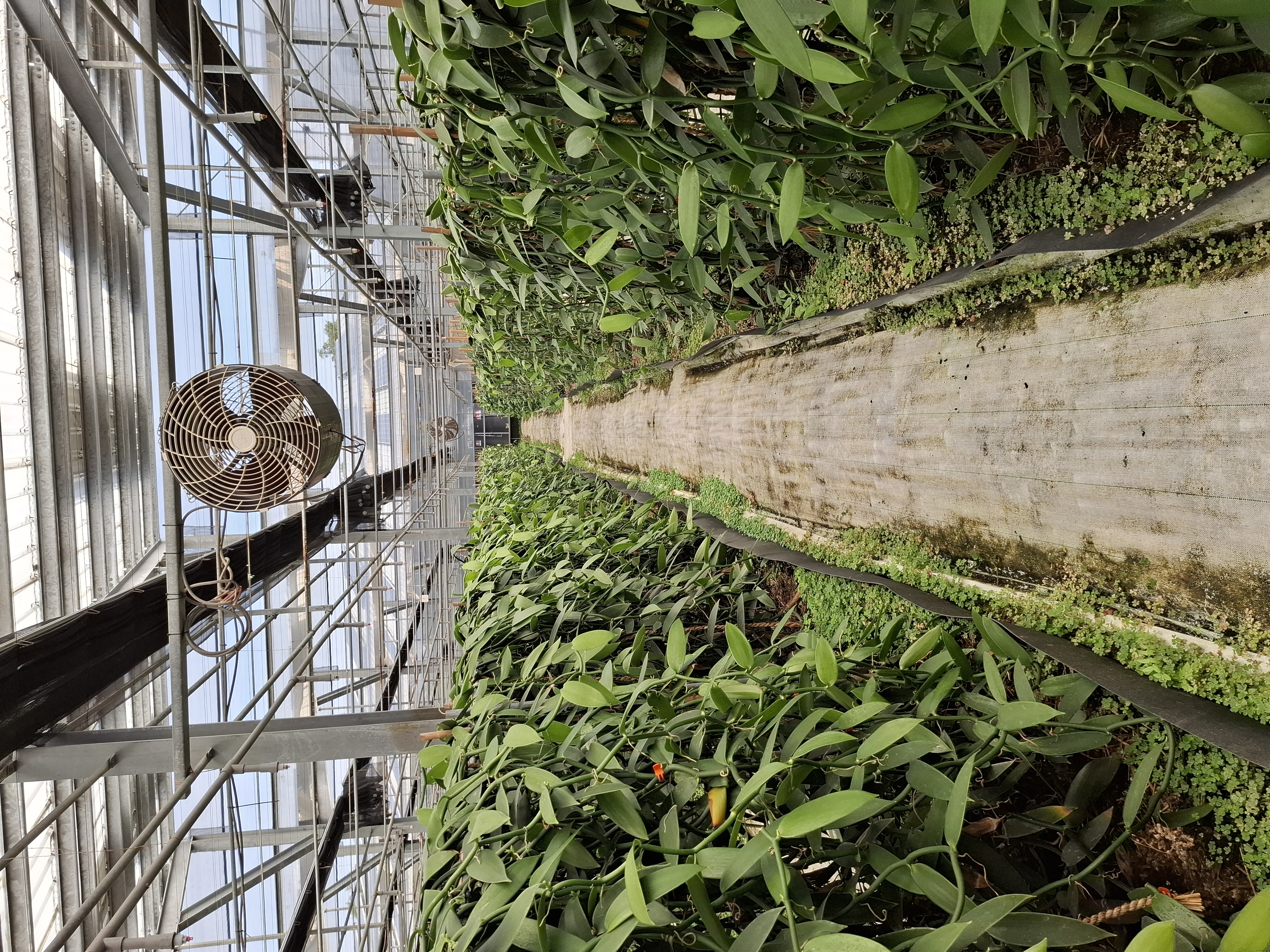 三合院香草園利用溫室光電太陽能板設施來調控日照與濕度,確保香莢蘭的健康生長。香莢蘭為蔓生植物,香莢蘭的種植方式是攀爬式栽培,通常會攀附在樹幹或支架上生長。