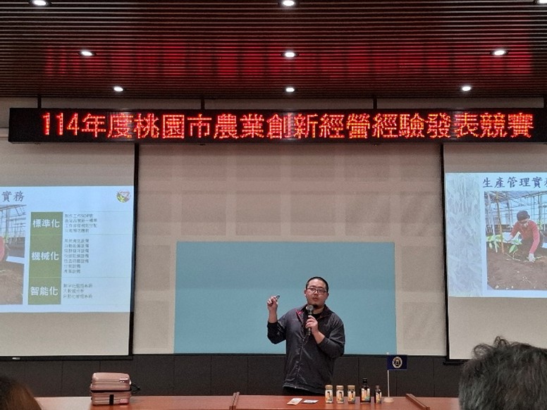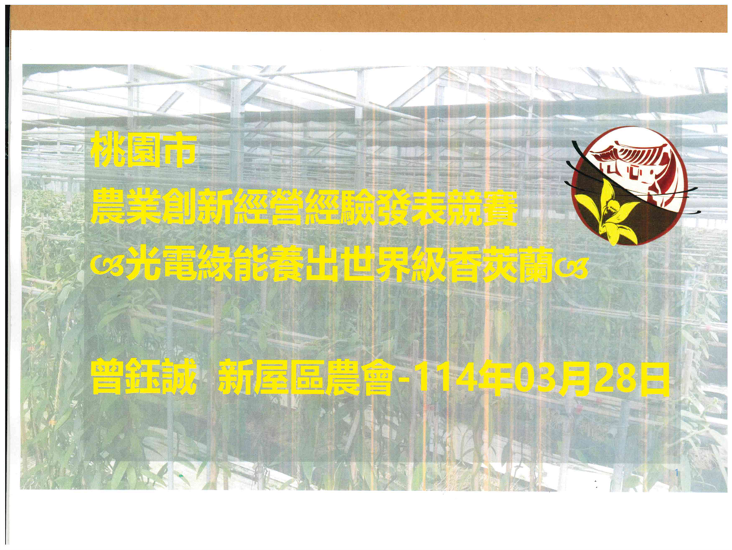 桃園市農會於3月28日舉辦114年度「桃園市農業創新經營經驗發表競賽~農業達人選拔大賽」,由農業部潘芃諭技士、農業部桃園區農業改良場姜金龍科長、中華民國農會巫姿瑩主任擔任評審委員。桃園區各農會都熱烈參與,競爭激烈。其中,新屋區農會的參賽代表-三合院香草園曾鈺誠場長以「光電綠能養出世界級香莢蘭」為題參與競賽,發表其卓越的農業技術與創新經營模式,成功脫穎而出,榮獲優勝獎的殊榮。