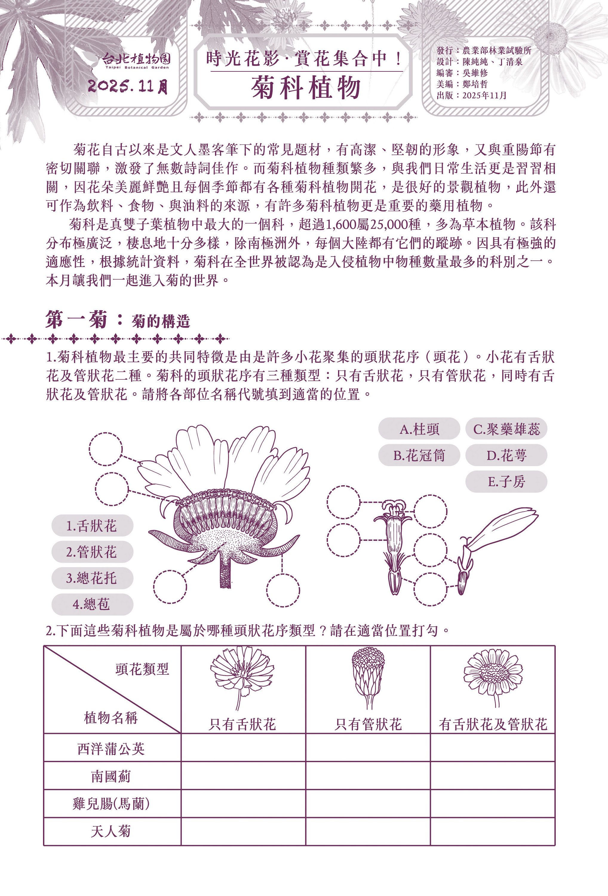 菊科是真雙子葉植物中最大的一個科,超過1,600屬25,000種,多為草本植物。該科分布極廣泛,棲息地十分多樣,除南極洲外,每個大陸都有它們的蹤跡。因具有極強的適應性,根據統計資料,菊科在全世界被認為是入侵植物中物種數量最多的科別之一。本月讓我們一起進入菊的世界。