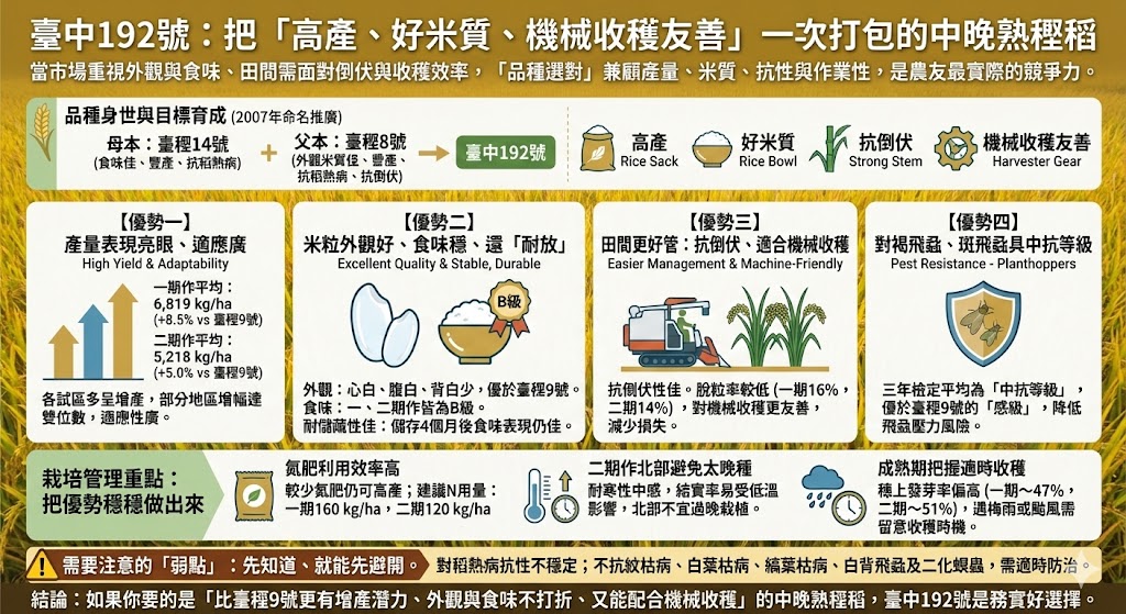 若你要用一句話抓重點:臺中192號走的是「高產+耐倒伏+好收穫+外觀乾淨+B級食味+耐儲藏」的務實路線。