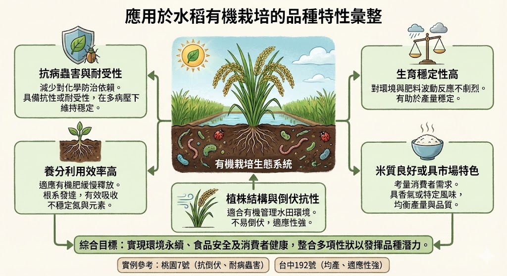 在臺灣經驗方面,有機稻作推廣也建立了對品種選擇的指引:適合有機栽培之品種需具備抗病、抗蟲、不易倒伏、適應性強、產量與品質達一定水準,並且在實際田間管理中搭配適當的肥培、灌溉、水管理與病蟲害防治策略,才能發揮品種的潛力。