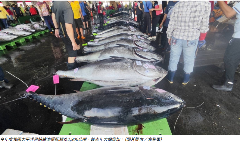 漁業署日前已公告今年度黑鮪管理措施,包括調增總漁獲配額、調降單船單航次可使用的黑鮪標籤數量。太平洋黑鮪年度總漁獲配額為2,900公噸,其中經許可從事太平洋黑鮪漁撈作業的鮪延繩釣漁船漁獲配額為2,680公噸,其他特定漁業漁船及定置漁業配額為20公噸;有赴太平洋作業許可並於東經128度以東混獲太平洋黑鮪的遠洋鮪延繩釣漁船配額為200公噸。