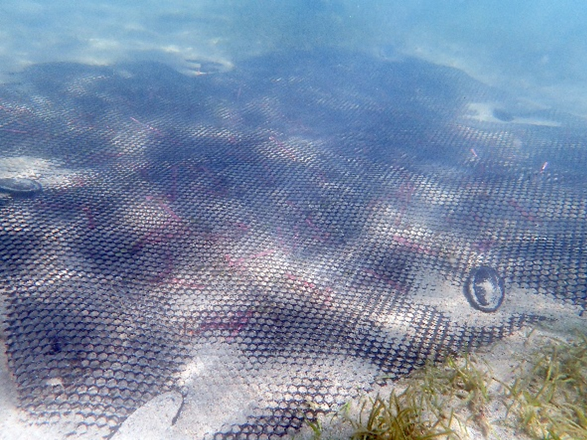 (2)精進海草復育技術研發「覆蓋法」,提高海草復育效率,並與今周行銷股份有限公司簽署海草復育合作案,由澎湖中心在通梁以所研發的「覆蓋法」復育海草,加速海草修補,以提高海草床的韌性(圖3、4)。