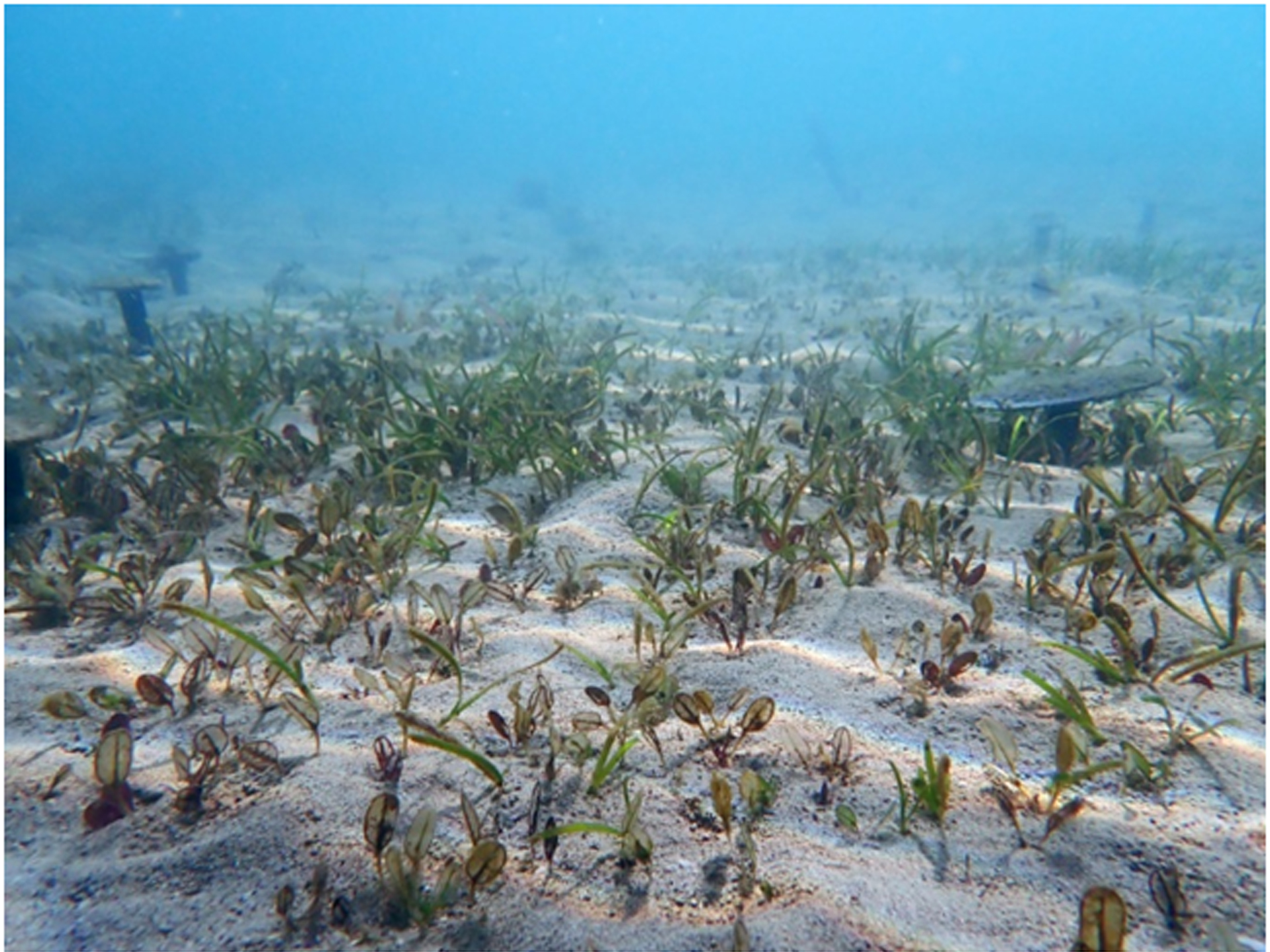 (1)確認以「根狀莖」法復育海草,可快速形成海草床,並可經由有性生殖的方式加速海草床面積的擴增,達到海草恢復的目的(圖1、2)。
