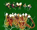 鐮孢菌主要以厚膜孢子在土壤、罹病組織或附著於種球表面長期存活。厚膜孢子為菌絲或大分生胞子特化而成,受到寄主根部分泌物刺激後,開始發芽侵入寄主根部,造成根部腐爛,導致植株產生黃化甚至萎凋死亡等現象,爾後病菌又在植株殘體上產生菌絲及大量分生孢子,成為第二次感染源。 |