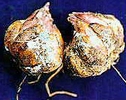 三種病原菌感染後不易由病徵區分,均須經由組織分離、培養病原菌後始可了解為何種病原菌所引起,但主要之病徵乃球根感染後組織明顯出現褐色斑點,以後病斑部出現凹陷斑點,嚴重時整粒球根縐縮,其上佈滿病原菌之菌絲,偶而亦可見病原菌之分生孢子,若病原菌侵入芽體附近組織,往往因菌絲蔓延而傷及芽體,此時球根無法種植,或種植後植株無法存活。 |