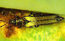 成蟲全身均深黑褐色,前翅除基部透明外,其餘部分為灰褐色,雄蟲體積較雌蟲小。幼蟲橙黃色,體細長。蛹淡黃色,觸角與足緊貼身體,胸背方具有翅芽。卵灰白色,腎型。