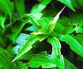 百合植株上端之幼嫩葉片被小蝗蟲嚼食,形成殘缺狀 |