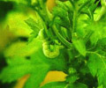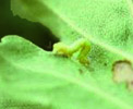 腹節無腹足,爬行時作尺蠖狀。老熟幼蟲吐絲結白色薄繭化蛹於葉背,初時蛹為淡綠色,老熟時為赤褐色。 |
