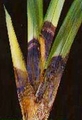 這些鐮胞菌也會感染國蘭偽球莖、根部及葉片,感染偽球莖時導致組織黑腐,地上部葉片枯黃;感染根部造成根組織黑腐,葉片失去光澤或萎凋;感染葉片則造成黑褐色近紡錘形或橢圓形的病斑,不容易和炭疽病初期病斑區別。這些感染國蘭不同部位的鐮胞菌菌絲生長最適溫度約28℃,最低溫6~8℃,最高溫32~36℃,引起的病害在中、高溫、多濕的季節最普遍,尤其在栽植密度高、噴灌頻繁、通風不良的蘭園中,發生最為嚴重。