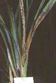 疫病菌通常為害國蘭葉片近基部組織,尤其是新生蘭株未完全展開的幼嫩葉片組織最容易受感染,受感染部位首先呈現水浸狀,逐漸擴大,受害組織最後腐敗而變成淡褐~黑褐色,最後整株乾枯(如圖),病徵不容易和白絹病及鐮胞菌引起的基腐病區別。