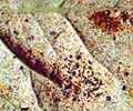 被害葉片從正面看有明顯灰白色點,葉背靠近中肋的兩旁可見多數聚集,葉背因銼吸所造成之傷口呈生鏽般之紅褐色,葉面因養分消失呈灰白色。