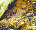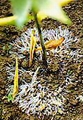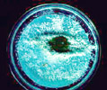 以植物葉片誘導白絹病菌之有性世代子實層產生   白絹病菌可由種球攜帶作遠距離傳播,圖中為進口種球受害後期產生大量菌核之情形