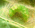 腹節無腹足,爬行時作尺蠖狀。老熟幼蟲吐絲結白色薄繭化蛹於葉背,初時蛹為淡綠色,老熟時為赤褐色。 |