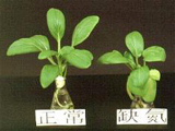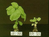 | 正常(右)與缺氮之蕹菜苗。缺氮之蕹菜苗,生育嚴重受阻,老葉黃化,部份葉肉出現燒焦之褐斑。 |