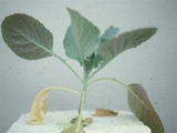 | 芥菜缺氮。老葉黃化嚴重,生育受阻。 |