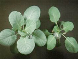| 正常(左)與缺氮之甘藍。缺氮之甘藍葉片較小,葉柄較長,生育緩慢,葉色較淡綠。 |