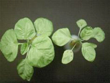 | 正常(左)與缺氮之莧菜,莧菜缺氮時生育受抑制,葉色較淡,下位葉尤其嚴重,葉肉偶伴有灰褐色之斑塊。 |
