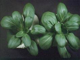 | 正常(右)與缺磷之青江菜。缺磷之青江菜,葉色較濃綠,葉片較小,挺立而厚,生育較緩慢。 |