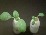 | 正常(右)與缺磷之青江菜苗。嚴重缺磷之青江菜苗,葉片變小、變厚,葉色深綠,生長極緩慢。 |