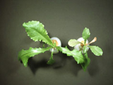 缺磷之蕹菜苗。葉片變小、變厚,葉型變鈍圓,葉色濃綠,生育緩慢。 |