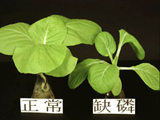 | 正常與缺磷之油菜。缺磷之油菜,葉色較綠,生長較緩慢。 |