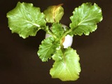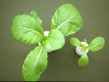 | 正常(左)與缺磷之甘藍苗。缺磷之甘藍,葉片變小、變厚,葉色深綠,生育較緩慢。 |