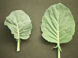 正常(右)與缺磷之芥藍葉片。缺磷之芥藍葉片較小、較厚,且葉色較綠。 |