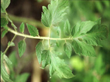 | 缺磷之蕃茄枝條。葉片變小、變厚,葉形變鈍圓,且部份葉脈基部呈現淡紅紫色。 |