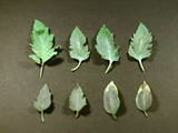 正常(左下)與不同缺磷程度之蕃茄葉片(老葉)。 |
