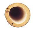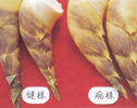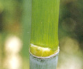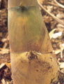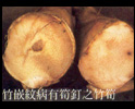 葉片呈現黃綠相間嵌紋,尤以近心葉最明顯,罹病竹筍之竹籜出現黑褐色條紋,筍肉內散生黃色至褐色斑點,此等斑點會在筍肉內上下延伸,即一般所謂「筍釘」。當竹筍發育時,黑褐色條斑即發展至竹桿木質纖維間,呈不連續狀,有時竹桿表面亦會出現此等不連續之褐色條斑,同時竹筍木質化,組織堅硬,顯著降低竹筍品質及經濟價值。 |