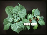 | 正常(左)與缺氮之青江菜。青江菜缺氮,葉色較黃綠,下位葉黃化尤其嚴重,且易從主脈附近均勻黃化。 |