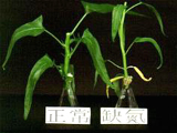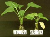 | 正常(右)與缺氮之蕹菜苗。缺氮之蕹菜苗,生育嚴重受阻,老葉黃化,部份葉肉出現燒焦之褐斑。 |