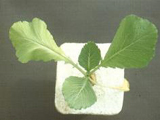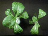 | 正常(左)與缺氮之白菜。白菜缺氮,全株葉色呈現黃綠,老葉甚至接近白色,生育受阻。 |