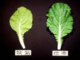 正常(左)與缺氮之芥菜。缺氮之芥菜,葉色較淡綠,生育緩慢,老葉易黃化。 |