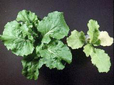 | 正常(左)與缺氮之甘藍。缺氮之甘藍葉片較小,葉柄較長,生育緩慢,葉色較淡綠。 |