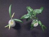 正常與缺氮之蕹菜枝條。缺氮之蕹菜枝條上之葉片,葉色淡綠,老莖嚴重黃化。 |