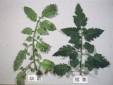 | 正常與缺氮之蕃茄葉片。缺氮葉片較小而硬,且黃化。 |
