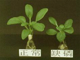 正常與缺磷之蕹菜枝條。缺磷之蕹菜葉片較小、較厚,葉片及枝桿顏色較綠,側芽之分蘗數較少,生育緩慢。 正常(左)與缺磷之芥菜。嚴重缺磷之芥菜,生育受阻,葉片變厚而小。