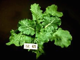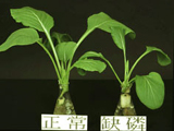 缺磷之皺葉白菜。葉片變小、變厚,老葉呈青綠,新葉呈濃綠。 正常與缺磷之黃金白菜。葉片變小、變厚,葉片較綠,生育緩慢。