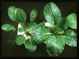 正常(右)與缺磷之青江菜。缺磷之青江菜,葉色較濃綠,葉片較小,挺立而厚,生育較緩慢。 正常與缺磷之青江菜。缺磷之青江菜,葉色較綠,部份葉片呈現皺縮。