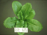 葉萵苣缺磷。葉色灰綠,葉片變小,且葉型呈現鈍圓狀。 正常(左)與缺磷之葉萵苣苗。缺磷之葉萵苣苗之葉片顯著變小、變厚,葉型鈍圓,葉色灰綠,老葉葉柄、葉脈及部份葉肉呈現紅紫色。