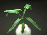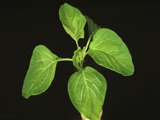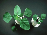 缺磷之皺葉白菜。葉片變小、變厚,葉色灰綠,老葉葉柄及部份葉脈呈現紫紅色。 缺磷之蕹菜苗。葉片變小、變厚,葉型變鈍圓,葉色濃綠,生育緩慢。