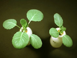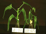 正常與缺磷之油菜。缺磷之油菜,葉色較綠,生長較緩慢。 正常(右)與缺磷之油菜。缺磷之油菜,葉片變小,挺立而厚,生育較緩,老葉葉柄呈現紫紅色。
