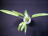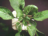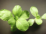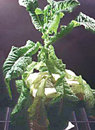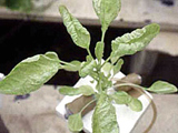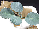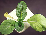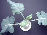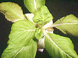 | 缺鋅之甘藍苗。新葉變小,厚而挺立,葉色呈現不正常之灰綠色。 |