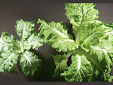 葉萵苣缺鋅。新葉變小、皺縮,葉色濃綠,下位葉黃化,葉尖、部分葉緣燒焦,葉肉出現褐色斑點。 |