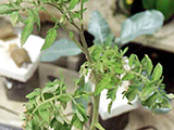 | 蕃茄缺鋅。葉片變小,捲曲,枝條先端向下捲曲,葉肉出現不規則之黃化斑點,嚴重者,有燒焦之褐色斑點、斑塊。 |