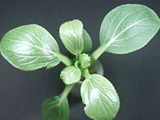 青江菜缺鋅。葉片變小、變厚,葉色呈現明亮灰綠色。 |